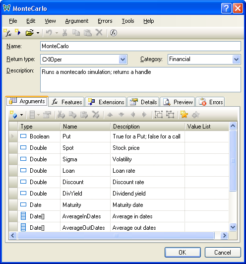 The "Arguments" tab of the XLL+ Function Wizard (under Visual Studio 2010)