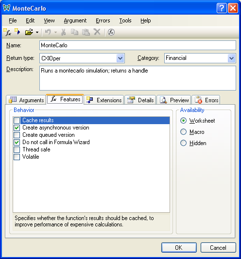 The "Features" tab of the XLL+ Function Wizard (under Visual Studio 2010)